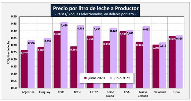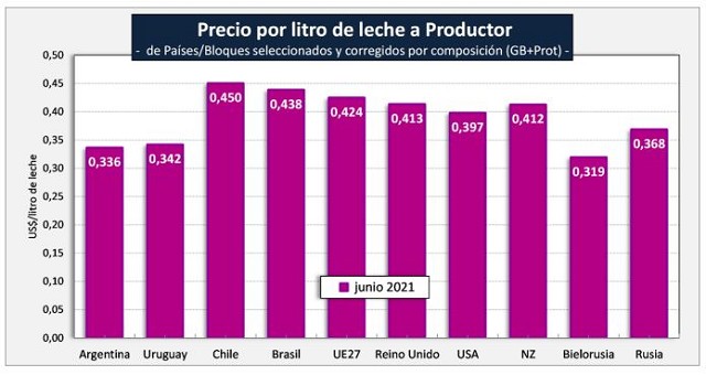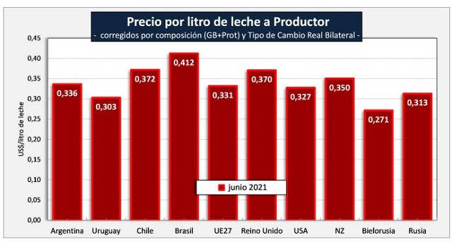 Observaciones: los precios en el gráfico de arriba han sido corregidos sólo por sólidos útiles (grasa butirosa y proteína) y no por el resto de componentes que hacen a la calidad higiénica y sanitaria, ni tampoco por tipo de cambio real bilateral con cada uno de esos países/bloques.