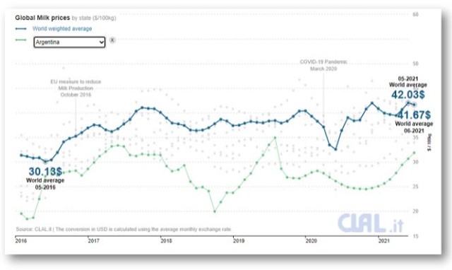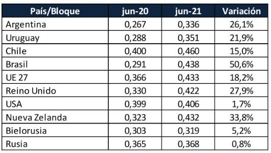 Fuentes: DNL-MAGyP, INALE, ODEPA, CEPEA/ESALQ USP, EMMO, USDA y CLAL, respectivamente.