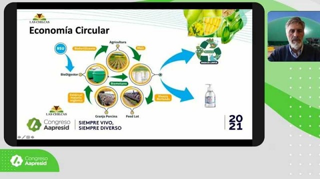 El esquema circular de Las Chilcas comienza con la agricultura. La energía del maíz entregada en alimento se convierte en carne o pasa al destilador para producir alcohol medicinal y bioetanol para corte de combustibles; de los residuos que quedan del proceso generan vinaza y burlanda para la producción ganadera y porcina; luego el estiércol, la materia orgánica y residuos domiciliaros del pueblo pasan al Bio Digestor para generar el biogás (biometano) que usan para abastecer la industria del establecimiento; los sedimentos se transforman en biofertilizantes que vuelven a la agricultura. "Entendimos la economía circular como interacciones entre las unidades de negocio y como desperdicio de cada una es insumo para otra, donde la energía no se pierde, sino que se transforma", subrayó el panelista.
