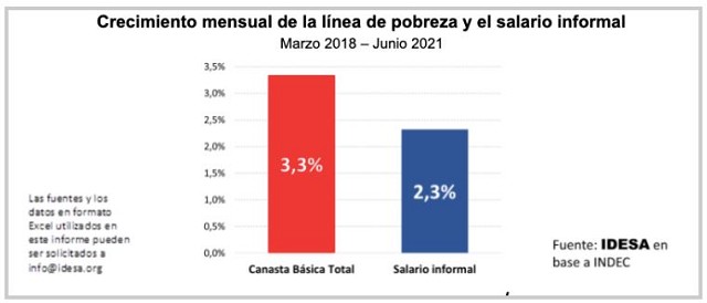 Estos datos sugieren que con una inflación del 3% mensual es muy difícil bajar la pobreza. El aumento de precios provocó que en los últimos 3 años el ingreso real de los trabajadores informales caiga a razón de 1% por mes. Por eso, la remuneración de los informales actualmente es un 33% inferior al nivel que tenían cuando comenzó la crisis. Esta es la razón fundamental por la cual la pobreza en el 1° trimestre del 2018 era de 26% y en el 2021 es del 40%. La inflación opera como una poderosa “fabrica” de pobres porque socava el ingreso de los trabajadores informales.