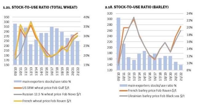 Si sacamos a China del análisis, dado que representa el 50% de los stocks globales y así y todo se ha transformado en uno de los mayores importadores de este cereal, para trigo se proyecta la relación stock / consumo en los paises exportadores, según la consultora francesa Strategie Grain, más bajo desde 2013. Como consecuencia, los precios esperados serian los más altos desde dicha campaña (ver gráfico adjunto).
