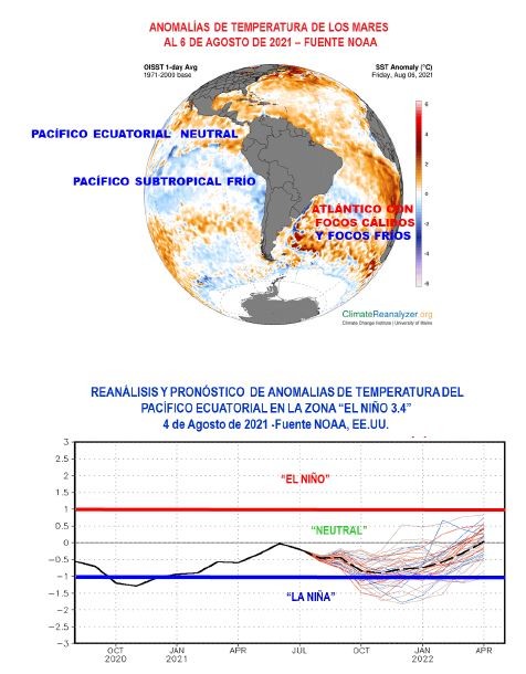 Al igual que en la temporada anterior, en lo que va del invierno de este año, la actividad del Polo Sur pasó a mostrar valores negativos por debajo de lo normal, siendo probable que se mantenga en ese estado la mayor parte del verano de 2022, impulsando masas de aire frío y seco hacia el interior del Cono Sur, y contribuyendo al desarrollo de un estado cercano a “La Niña” al empujar hacia el Ecuador la masa de aguas frías que ocupa el Pacífico Subtropical.