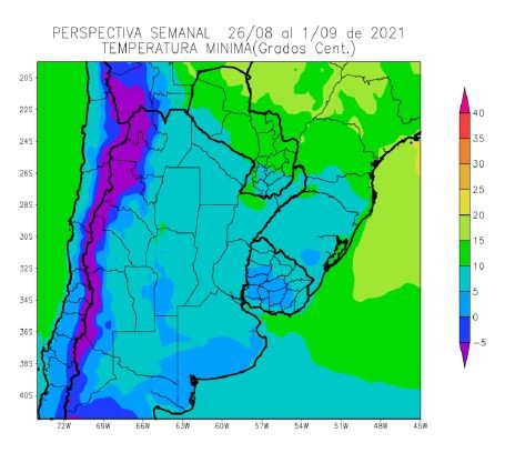 El este del NOA, la mayor parte de la Región del Chaco, el sudeste del Paraguay, el norte y el centro de la Mesopotamia y el oeste de la Región Pampeana observarán temperaturas mínimas superiores a 5°C, con riesgo de heladas localizadas y un foco hacia el norte con valores superiores a 10 y 15°C y otros focos con valores menores.