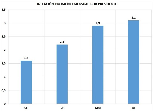 Pero no solo el actual gobierno aumentó los impuestos y viene tomando deuda pública a un ritmo más veloz que al ritmo que tomó Macri, sino que, además, tiene la tasa de inflación promedio mensual más alta que Cristina Fernández y que Macri, aclarando que a Macri le dio una inflación más alta, entre otras cosas, por el incremento de las tarifas de los servicios públicos. Dicho más precisamente, el aumento del IPC se vio afectado por la recomposición de las tarifas de los servicios públicos que había atrasado Cristina Fernández y que este gobierno vuelve a atrasar.