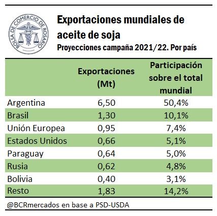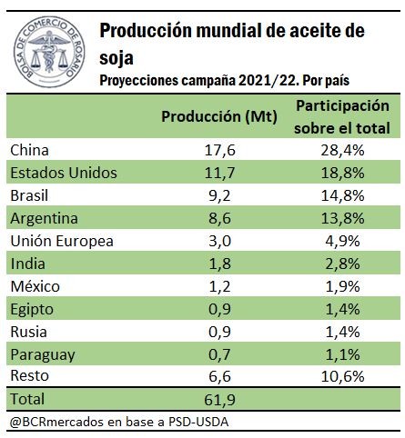 La producción mundial de aceite de soja se puede estimar superando los US$ 70 mil millones para la campaña 2021/22. No obstante, de casi 62 Mt que se esperan producir en la campaña venidera, sólo un 20% será exportado. Los tres primeros productores de aceite son gigantes demográficos, encontrándose sólo a la Argentina como un país con un saldo exportable considerable para el comercio mundial.