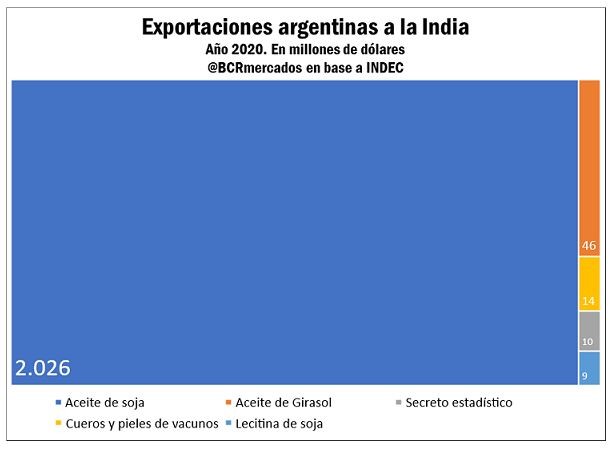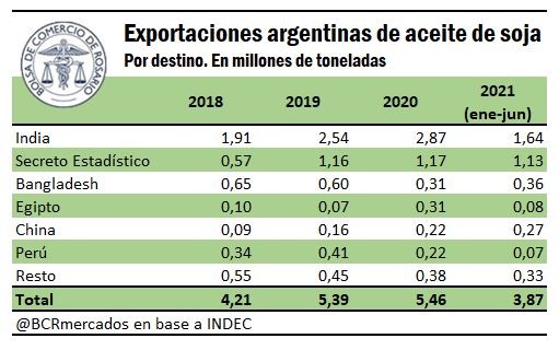 Argentina exportó aceite de soja a la India por más de US$ 2.000 millones sólo en el año 2020, y en 7 meses del 2021 lleva exportados cerca de US$ 1.746 millones. El promedio de los últimos 5 años muestra exportaciones por US$ 1.762 millones.