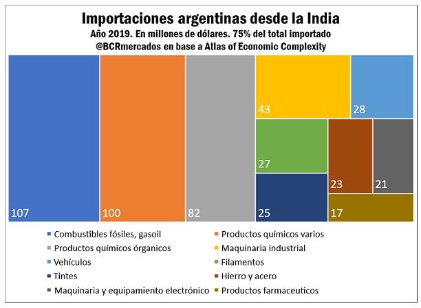 A pesar del superávit comercial bilateral que nuestro país disfruta con la India, es menester destacar que las exportaciones de la India a nuestro país se encuentran mucho más diversificadas. Con una amplia variedad de productos, Argentina importa maquinaria agrícola, productos de la industria química y combustibles desde la India, entre otros productos.