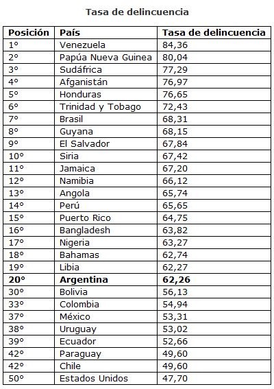 Las menores tasas corresponden a Qatar, Taiwán y Emiratos Árabes Unidos, con valores inferiores a 20 puntos. Suiza tiene un coeficiente de 21,58, valor similar al de Japón, que registra 21,67. Sin embargo, desde el Centro de Estudios de la Nueva Economía (CENE) de la Universidad de Belgrano aportan que, a priori, resulta difícil correlacionar los datos de delincuencia con variables socio-económicas.