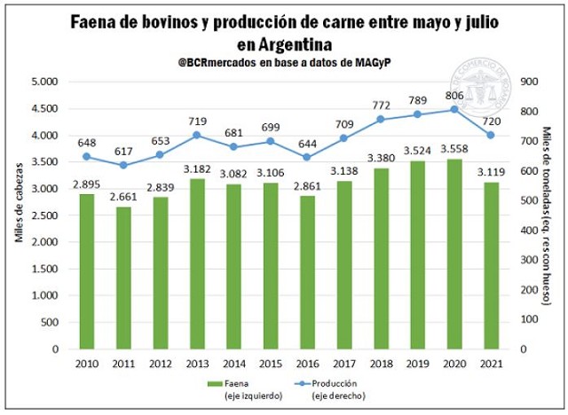 Comenzando por la faena y teniendo en cuenta que el cierre de exportaciones se inició en mayo de este año procedimos a comparar los meses de mayo-junio y julio del 2021 con años previos.