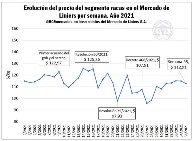 Por otra parte, desde el comienzo del año las cotizaciones del Mercado de Liniers para las vacas (principal grupo afectado por las últimas restricciones de exportación y mercadería de demanda china), se redujo un 1,7%, pasando de $ 114,9/kg vivo a $ 112,9/kg vivo, mientras que se encuentra lejos de los $125,3/kg vivo que se registró en la semana de publicación de la Resolución 60/2021 en abril.