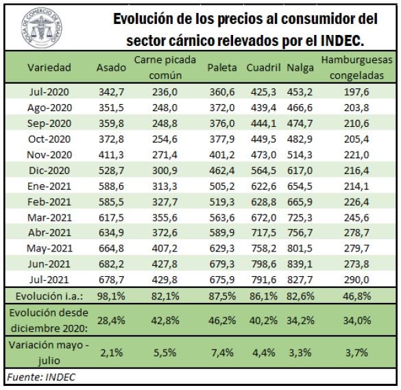 Finalmente, desde el cierre de las exportaciones hasta la fecha, los consumidores no han registrado bajas considerables en los precios en góndola de los productos ya que a pesar de las restricciones más severas que se aplicaron desde mayo, los valores de los cortes de carne bovina no registran disminuciones, sino que sólo tuvieron alzas menos pronunciadas que las que se venían registrando en los meses previos.
