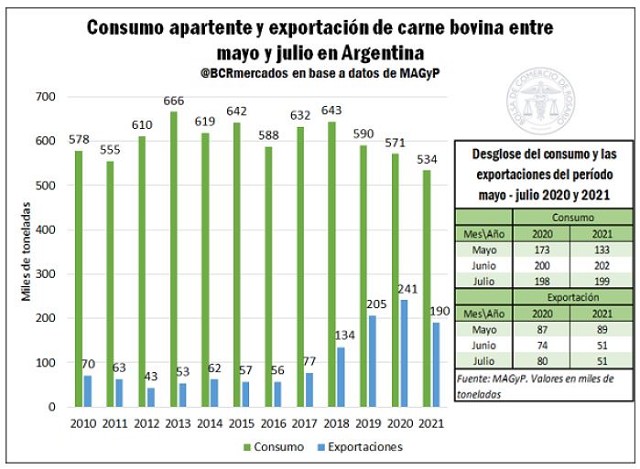 Si realizamos el mismo análisis para el consumo y las exportaciones de carne bovina, se obtienen resultados similares. Respecto al 2020, el consumo aparente cayó un 6,5% en estos 3 meses, mientras que las exportaciones tuvieron una reducción de casi un 21%. En otras palabras, se consumió menos carne internamente y se envió al exterior cerca de una quinta parte menos en tonelaje. Valuando la diferencia entre las toneladas enviadas al exterior entre mayo y julio de 2021 y 2020 a precios promedio de los primeros 6 meses del 2021, se obtiene que la caída en los ingresos de divisas por exportaciones rondarían los US$ 150 millones.