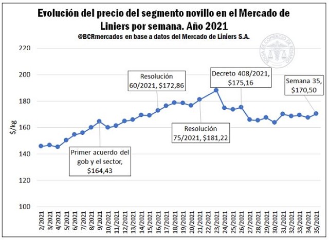 Por el lado de los precios internos, y más puntualmente, aquellos para los productores de ganado bovino, se vislumbra una dinámica alcista en los primeros meses del año, con mermas tras la aplicación de las medidas más restrictivas a partir de mayo para los precios del novillo en el Mercado de Liniers S.A. En este sentido, entre comienzos del año hasta la semana 35 (hasta sábado 28 de agosto) el valor se incrementó un 16,8% pasando de $ 145,9/kg vivo a $ 170,5/kg vivo. No obstante, se registra una caída del orden del 6% desde la aplicación de la Resolución 75/2021 (cierre de exportaciones en mayo) hasta finales de agosto.