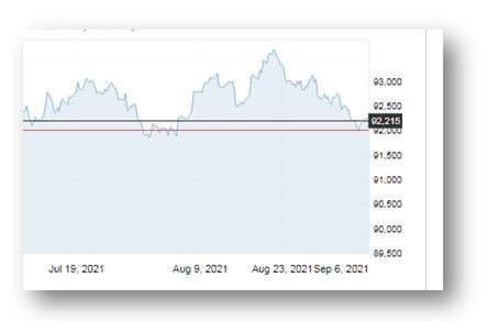 El gráfico que sigue lo muestra claramente. Se trata del índice dólar desde principios de julio a la fecha (Investing.com).