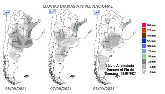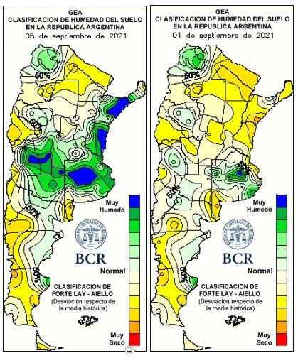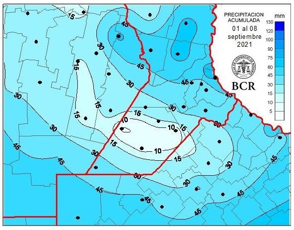 La región núcleo recibió 32 mm en promedio en los primeros 8 días de septiembre. Para el noroeste bonaerense y el sudeste cordobés son las primeras lluvias que luego de 3 meses superan los 10 mm. Hay un sector del sudeste cordobés que registró acumulados por debajo de los 15 mm, como Canals. A pocos kilómetros, en Noetinger se registraron 64,5 mm. Se destacan las lluvias en el centro sur de Santa Fe: Irigoyen marcó 66 mm y Clason, 65 mm. En el noroeste bonaerense, General Pinto recibió 50 mm y General Villegas, 49 mm. Hacia el noreste de Buenos Aires, Baradero registró 43 mm y Ramallo 37,5 mm. Estas lluvias, que caen en el momento en que la mitad de los lotes están encañando y la otra mitad en macollaje, permitirán restablecer el estado del cultivo y arrancar los estadios definitorios con mejores condiciones.