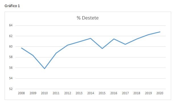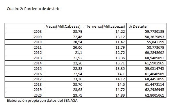 A este escenario con un claro sesgo de liquidación de madres, se le sumó otro índice negativo como es el porciento de destete (Cuadro 2). La falta de rentabilidad, bajó la inversión en tecnología, sanidad y alimentación en el sector de la cría, bajando el porciento de destete y por lo tanto se dejaron de producir en tan solo 3 años 2,75 millones de terneros.