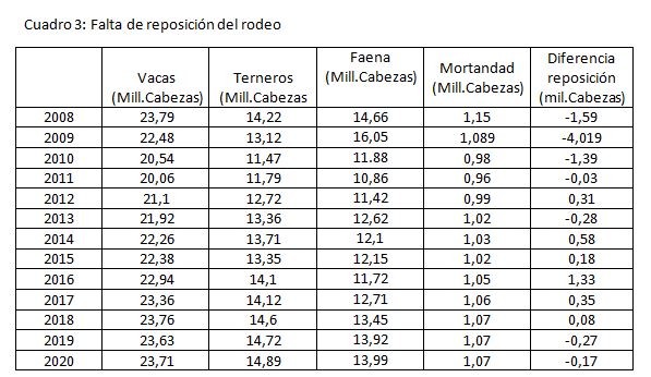 Si hacemos este cálculo (Cuadro 3), observaremos que la producción de terneros en los años 2008, 2009, 2010 y 2011, no alcanzaron a cubrir la hacienda que debíamos reponer. Esta diferencia explica por qué la pérdida de 10 millones de cabezas del rodeo.