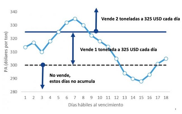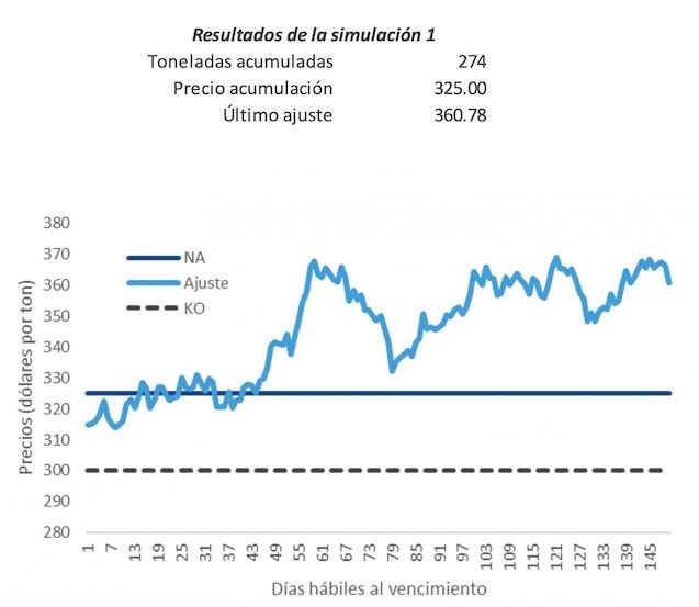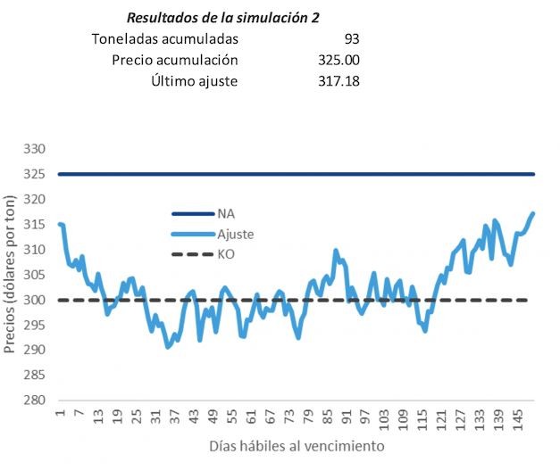 El precio de ajuste desde el primer día de vida de la estructura hasta su vencimiento es mayor al nivel de acumulación. En este caso se duplicaría el volumen diario todos los días y el volumen acumulado alcanzaría el máximo posible llegando a 300 toneladas.
