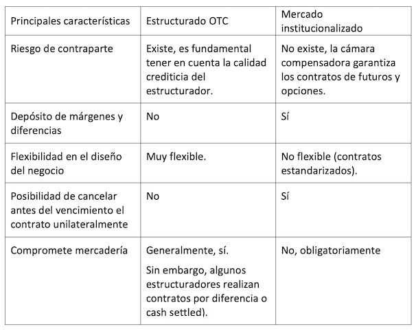 Figura 1: comparación de las principales características de coberturas realizadas mediante un contrato estructurado OTC y mercados institucionalizados