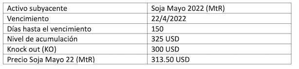 Figura 2: Resumen de las características de un acumulador para el productor de soja nueva cosecha cotizado el día 10/9/2021.