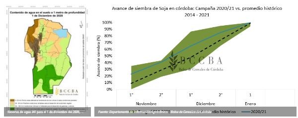 A inicios de octubre el contenido de agua en tel suelo a 1 metro de profundidad reflejaba un perfil de humedad no óptimo para la siembra de los cultivos más tempranos y bajo condiciones de La Niña, motivo por el cual gran parte del sector agrícola en Córdoba tomó la decisión de ir hacia una siembra con cultivos tardíos. Así, las fechas de siembra tardías alcanzaron valores por encima del promedio en los meses de noviembre y diciembre, gracias a que las condiciones de humedad mejoraron.