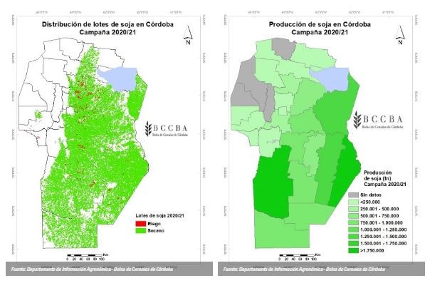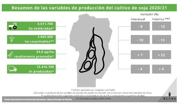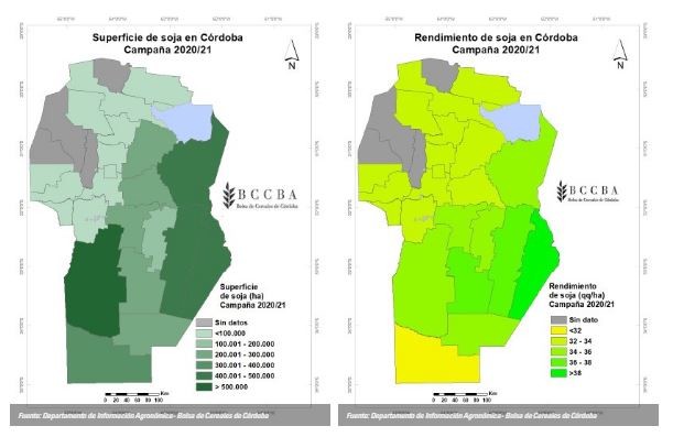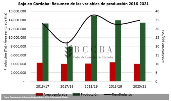 La superficie sembrada fue de 4.011.700 hectáreas y representa un 13 % menos que el promedio histórico 2007 - 2020. El motivo de esta disminución es principalmente el aumento del área sembrada con maíz en los últimos años y significa una mejora en las rotaciones. La mayor superficie se encuentra en los departamentos Río Cuarto y Marcos Juárez, mientras que el área bajo riego se concentra esencialmente en la zona norte de la provincia (departamentos Río Primero y Totoral).