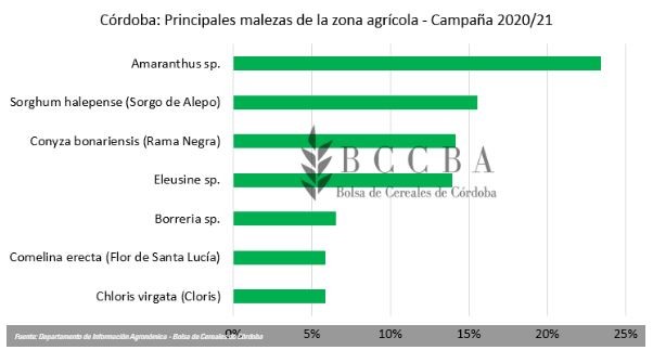 El principal factor potencialmente reductor del rendimiento contra el que tuvieron que enfrentarse los productores durante la campaña 2020/21 fue nuevamente la competencia con malezas, que debido a la falta de agua y a la resistencia creciente a herbicidas continúa siendo el mayor enemigo de la producción.