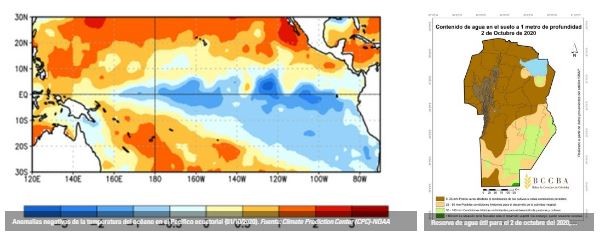 Al analizar la temperatura superficial del mar en el océano Pacífico ecuatorial, a inicios de la primavera austral en el año 2020, se evidenció que comenzó con anomalías negativas, lo que marcó el inicio de condiciones climáticas de La Niña, evento que se mantuvo hasta el mes de marzo. Es de importancia destacar que la provincia de Córdoba se caracteriza por tener precipitaciones por debajo de la media bajo condiciones de La Niña en este período.