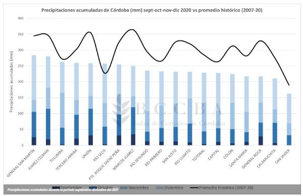 A inicios de enero del 2021 las condiciones de La Niña seguían presentes y se mantuvieron hasta marzo. Sin embargo, las precipitaciones en el periodo comprendido entre diciembre y marzo, que abarcó gran parte de la siembra de los cultivos estivales y el periodo crítico, tuvieron un régimen que igualó o superó los registros históricos en la mayoría de los departamentos en Córdoba, lo cual difiere a lo esperado para un evento La Niña.