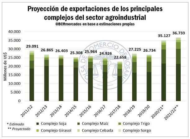 Así, en base a las proyecciones de producción y exportación de los principales cultivos, a los precios actuales el complejo agroindustrial argentino lograría un ingreso de divisas de US$ 36.700 millones, sumando los principales granos y derivados. De efectivizarse este guarismo, se superaría en más de US$ 1.600 millones la marca del ciclo actual, y se estaría en un máximo histórico en materia de valor de las exportaciones de los principales complejos del sector.