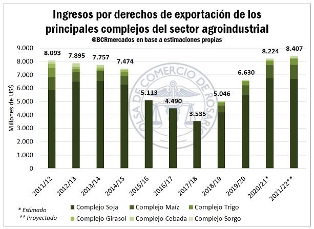 De efectivizarse estas proyecciones, el Estado recaudaría en materia de derechos de exportación un total de US$ 8.400 millones, más de US$ 150 millones por encima del aporte estimado de la campaña 2020/21. Además, podría llegar a ser el mayor monto que ingrese a las arcas del tesoro por este concepto de los últimos diez años. Otro punto para remarcar es que, dada la mayor producción y las mayores exportaciones, el maíz superaría los US$ 1.000 millones en aportes por DEX por primera vez en la historia.