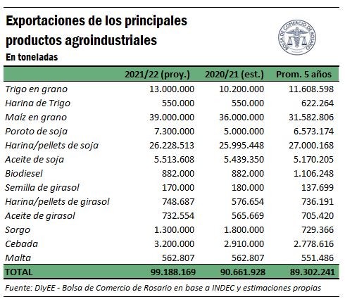 En base a estas estimaciones de producción, se proyectan exportaciones totales por los principales rubros de las cadenas agroalimentarias por 99,2 millones de toneladas, lo que podría convertirse en el segundo mayor registro de la historia, distribuidas de acuerdo con el cuadro que sigue a continuación. Sólo la campaña 2018/19 superó en cantidad las ventas al exterior previstas para el nuevo ciclo, con 100,9 Mt. Esperemos que el clima no juegue en contra de esta posibilidad.