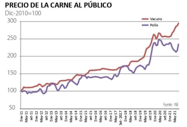 En efecto, la carne vacuna subió 15% en el último año, presionando al alza la inflación. Además, al ser un producto clave en la canasta de alimentos, genera aumentos indirectos en otros productos.