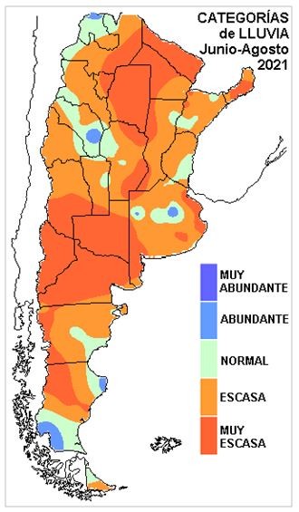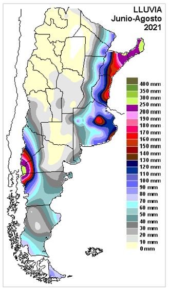 El análisis que debemos hacer de este mapa, necesariamente debe quedar acoplado a lo sucedido en el otoño. Si no se hubiese dado el generoso aporte pluvial desde mediado de marzo hasta finales de mayo, el tránsito del invierno para las sementeras de trigo que sembradas, habría sido realmente difícil y el panorama de rendimientos potenciales a estas alturas del año sería muy poco favorable, por no decir inviable para muchos sectores. Es decir dentro de la volatilidad que vienen presentando las lluvias, por momentos las mismas tuvieron recuperaciones muy oportunas. En definitiva, desde el punto de vista meteorológico, el invierno no ha sido bueno en cuanto a lluvias, sobre todo por la ausencia de las lluvias de mantenimiento sobre la provincia de CB, normalmente pobres pero con un efecto significativo en la preservación de la humedad superficial. Otros sectores no han sufrido tanto este panorama desde el punto de vista agronómico, aun cuando las precipitaciones no lograron alcanzar los valores normales.