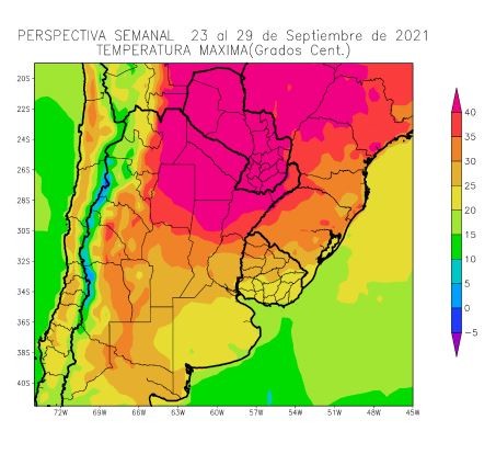 La primera etapa de la perspectiva, comenzará con vientos del trópico que provocarán temperaturas máximas superiores a lo normal en la mayor parte del área agrícola, y sólo el sudeste de su extensión recibirá vientos marinos que mitigarán los registros.