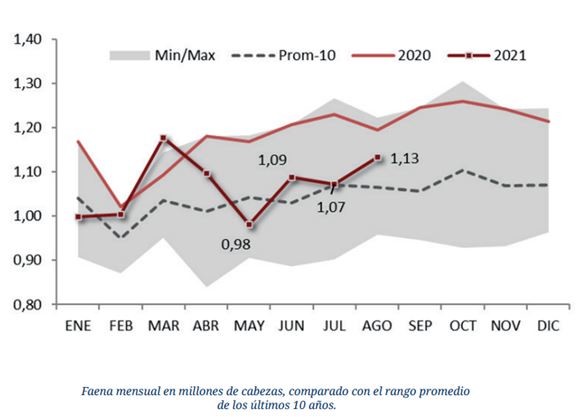 En los primeros ocho meses de este año, se sacrificaron 8,55 millones de bovinos, casi 8% menos (716.000 bovinos) que en igual período de 2020. A pesar del fuerte nivel de actividad registrado durante el último mes, los datos acumulados siguen marcando una tendencia claramente decreciente.