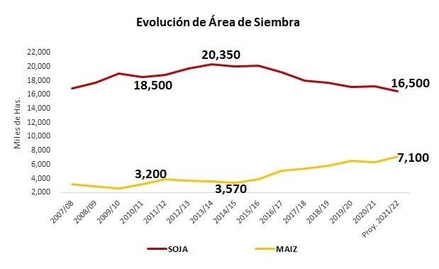 La soja, una oleaginosa que ingresó a la Argentina en el siglo XIX, no alcanzó importancia sino hasta la década del 80, cuando desde una superficie sembrada de 2.000 hectáreas, comenzó un camino de crecimiento, que no se detuvo hasta la campaña 15/16, cuando alcanzó la máxima superficie sembrada, 20.56 millones de hectáreas, un crecimiento de casi 1000% en solo dos décadas y media. El maíz, que también ingreso al país hace más de un siglo, mantuvo su área de siembra entre dos y cuatro millones de hectáreas, hasta la campaña 10/11, cuando comenzó a expandirse más de 100% en una década, pasando a 9,7 millones de hectáreas de maíz sembrado en la 20/21. El crecimiento de área de soja sembrada fue categóricamente superior al de maíz, permitiendo cosechas cada vez más grandes. Se observa que desde la 15/16 la superficie de siembra de soja fue disminuyendo, y, por el contrario, la de maíz fue aumentando hasta pasar de una relación de 6 hectáreas de soja por 1 hectárea de maíz, a proyectarse una siembra de 2 hectáreas de soja por 1 de maíz, según las estimaciones de la Bolsa de Cereales de Buenos Aires para la campaña 21/22.