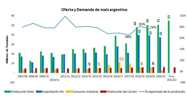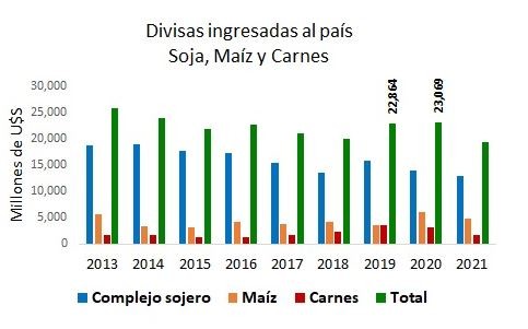 Si la producción de carnes no se expande durante el 2022, y el panorama internacional va hacia una mayor oferta internacional de maíz, y menor nivel de demanda, el aumento productivo de maíz, podría no ser absorbido por la exportación, y entonces deprimir el mercado interno de maíz, al tiempo que reduciría el ingreso de divisas de parte de soja, por la menor producción.