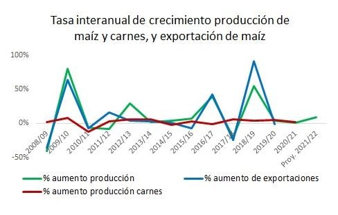 En el siguiente gráfico se observan las tasas de crecimiento o decrecimiento interanual de la producción de maíz y carnes, y la exportación de maíz.