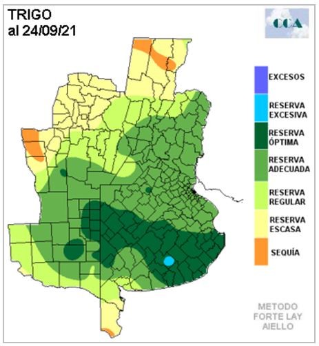 Por estas fechas los cultivares de trigo sembrados en forma temprana sobre ER y SF ya inician su etapa de floración, condición que progresivamente se irá expandiendo hacia el oeste. En esta etapa el trigo aumenta su demanda hídrica y dado que no están previstas lluvias en el corto plazo, el estado de las reservas comienza a ganar protagonismo. En el mismo sentido, las masas de aire frío han perdido presencia y si bien aún no puede garantizarse que no aparezca alguna situación de riesgo térmico, la probabilidad de que esto suceda ha disminuido sustancialmente.