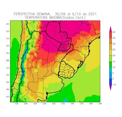 Al inicio de la perspectiva, los vientos del trópico dominarán todo el norte y el interior del área agrícola, produciendo temperaturas por encima de lo normal, mientras las zonas cercanas al Litoral Atlántico recibirán fuertes vientos marinos, que determinarán registros algo bajo el promedio estacional Paralelamente, tendrán lugar el paso de un frente con actividad irregular, produciendo precipitaciones moderadas a abundantes sobre el nordeste y el sur del área agrícola y valores escasos sobre la mayor parte del resto. Junto con el paso del frente, comenzará la entrada de vientos del sur, que se extenderán sobre la mayor parte del área agrícola, aunque sin alcanzar su porción centro-norte. Las zonas serranas del oeste, el sur de la Región Pampeana y gran parte del Uruguay observarán el riesgo de heladas localizadas.