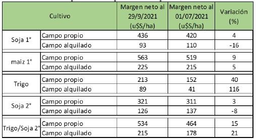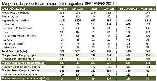 La última actualización de los márgenes netos de setiembre muestra cómo siguen afirmándose los cereales pese a las subas de los fertilizantes y cómo pesan las subas en los insumos en soja con los actuales precios de los commodities. La oleaginosa en campo alquilado es la que sufrió los mayores descuentos: 16% para soja de 1ra y 8% para soja de segunda. Hay que tener en cuenta que más del 60 a 70% del área cultivada con la oleaginosa de la región núcleo se hace en esta situación. Y que estos márgenes se hacen teniendo en cuenta un flete largo de 150 Km, por lo que más allá de este límite, los resultados son inferiores. Más allá del precio interno de la soja, también pesa en esta actualización el aumento de insumos como glifosato, o la fertilización con MAP (mono fosfato mono amónico) como arrancador. En cambio el maíz muestra espalda suficiente para responder al significativo y sostenido aumento de la fertilización. Para la misma situación, en campo alquilado, la comparación de márgenes netos de setiembre vs junio muestra una mejora de un 5%. El maíz temprano sigue manteniendo el primer lugar en el podio de los resultados. Al trigo también le resulta favorable la foto de márgenes de setiembre: hay un repunte importante en los márgenes en trigo con subas que superan el 40% respecto a junio.