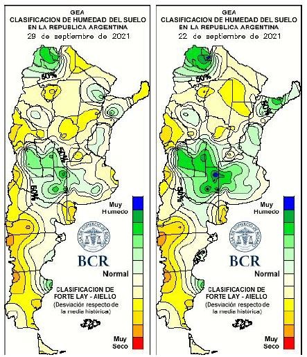 En el trigo, el periodo más crítico para el déficit hídrico es la floración. Un 5% de los lotes está en espigazón, un 30% con la espiga embuchada, un 40% emitiendo la hoja bandera y un 25% todavía encañando. Las expectativas por las lluvias del sábado son muy grandes: el cultivo sigue muy bueno pero necesita milímetros con urgencia para mantener el máximo potencial de rinde. En Cañada Rosquín, se necesitan al menos 10 mm para aumentar el tamaño de la espiga y el peso de los granos. En Pergamino, las lluvias de los próximos 15 días serán esenciales para mantener las perspectivas de rinde en torno a los 50 qq/ha. En Canals, se precisan al menos 50 mm para alcanzar el potencial planteado a la siembra. Si estas lluvias no llegan, podrían comenzar a aparecer cuadros en estado regular. Solo un 5% de los lotes se los clasifica como excelentes, el 75% está en muy buenas condiciones y el resto bueno.