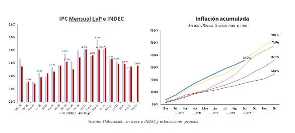 Esto representa una suba en la tasa de inflación respecto al mes anterior, que informó el INDEC (2,5%). De esta manera la inflación acumulada en 2021 es del 36%, mientras que en términos anuales fue del 51,4%, al igual que en agosto. La inflación acumulada en los 9 meses del 2021 es la segunda más grande de los últimos 5 años, solamente superada por la del 2019 que se ubicó en 37,7%. Recordemos que en agosto del 2019, los resultados de las PASO presidenciales, generaron una devaluación del tipo de cambio, que repercutió en la inflación del mes siguiente. En tercer lugar se encuentra el 2018, con una inflación acumulada del 32,4%. Luego lo sigue el 2020 (22,3%) y, en último lugar, el 2017 (17,6%).