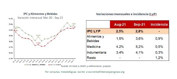 Desde septiembre del 2018 que el rubro Alimentos y Bebidas crece por encima del IPC General en términos interanuales. En términos mensuales, en 7 de los últimos 12 meses la evolución del nivel de precios del rubro Alimentos y Bebidas se incrementó por encima que el índice general. En agosto se registró una suba de alimentos (1,5%) 1,0 puntos porcentuales menor al Índice General en términos mensuales (2,5%). En septiembre los alimentos superaron al Índice General (3,6% vs 2,8%). Analizando el margen, la incidencia del rubro Alimentos y Bebidas sobre el índice general (2,8% mensual) fue del 0,9%.