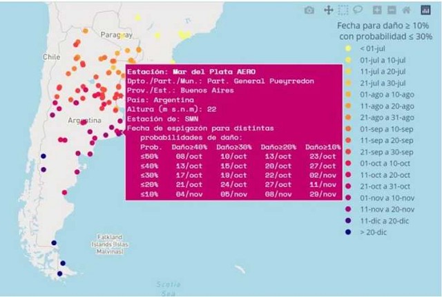 “El hecho de que el mapa sea interactivo permite interpretar mejor la información volcada porque en la escala mayor del mapa hay algunas estaciones superpuestas que no pueden verse con claridad a menos que se pueda hacer zoom”, explicó Abbate y agregó: “Basta con pararse con el cursor en cada uno de los puntos para ver reflejado el porcentaje de daño por helada en cada una de las fechas propuestas”.
