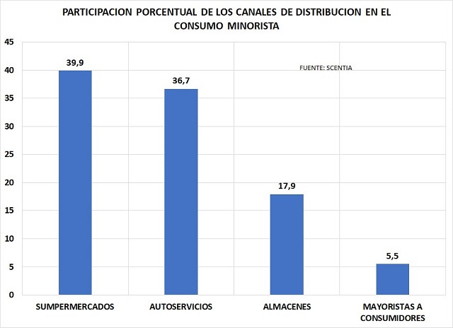 De acuerdo a los datos de Scentia, las compras de alimentos, bebidas, cósmeticos y artículos de limpieza, el consumidor final las hace solo en un 39,9% en los supermercados. En otras palabras, los supermercados abarcan solamente el 40% de las ventas minoristas de estos rubros y el resto se reparte entre autoservicios, almacenes y supermercados mayoristas que venden a consumidor final, sin tomar frutas, verduras y carnes se compran en verdulerías y carnicerías y mínimamente en supermercados