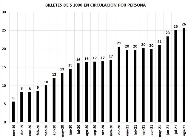 La cruda realidad es que, en promedio, en noviembre de 2019 cada argentino tenía en su bolsillo $ 6 billetes de $ 1.000 y en agosto pasado tenía $ 26 billetes de $ 1.000. Sin embargo, la gente cada vez está peor económicamente porque lo que más se produce en Argentina son billetes de pesos y lo que menos se estimula y más se castiga es la producción de bienes y servicios.