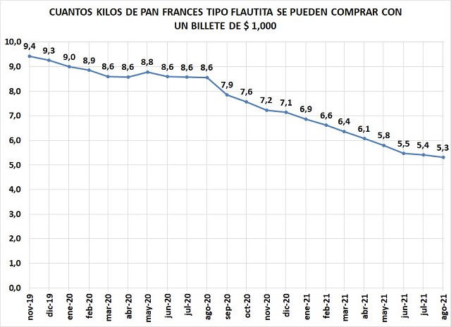 Por ejemplo, tomando los datos que utiliza el INDEC para el Gran Buenos Aires para estimar el IPC, vemos que en noviembre de 2019 con un billete de $ 1.000 se podían comprar 9,4 kilos de pan francés tipo flautita y en agosto solo se podían comprar 5,3 kilos. Es decir, con ese billete de $ 1.000 la gente puede comprar un 43,6% menos de pan francés.