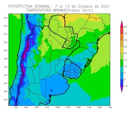 El este del NOA, el sudeste del Paraguay, el sur de la Región del Chaco, la mayor parte de la Mesopotamia, el norte de Córdoba y el norte de Santa Fe observarán temperaturas mínimas superiores a 10 °C, con un amplio foco con valores superiores a 15 y 20°C y otros con valores inferiores.